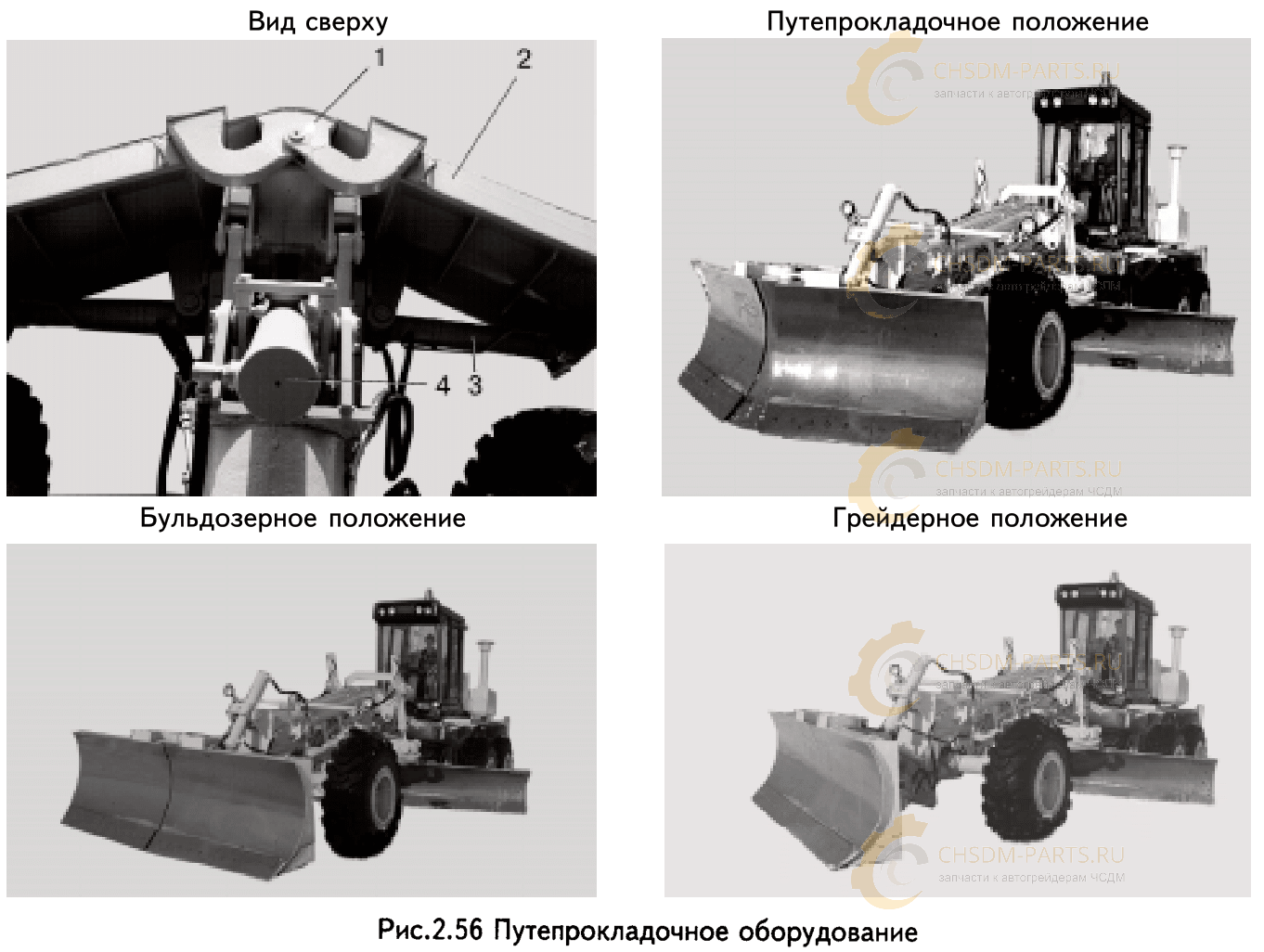 Отвал путепрокладочного оборудования состоит из трех основных частей: центрального отвала и шарнирно соединенных с ним двух крыльев. Центральный отвал через проушины соединен со штоком гидроцилиндра, с помощью которого производится подъем и опускание всего отвала. Крылья отвала с помощью двух гидроцилиндров могут устанавливаться в путепрокладочное, бульдозерное и правое или левое грейдерное положения. При необходимости одно крыло может находиться в путепрокладочном, а второе - в бульдозерном положениях. Поворот крыльев вокруг вертикальной оси происходит при выдвижении штоков гидроцилиндров.